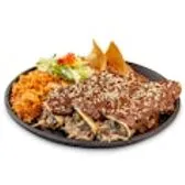 Three soft-rolled corn tortillas filled with shredded chicken , covered in our home-style mole sauce, and topped with sesame seeds. Served with Mexican red rice and refried beans.