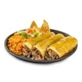 Three soft-rolled corn tortillas filled with shredded chicken and smothered with our zesty tomatillo sauce. Served with Mexican red rice and refried beans