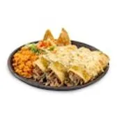 Three soft-rolled corn tortillas filled with fresh Mexican cheese, topped with tomato sauce and cheese crumbles. Served with lettuce, tomato, Mexican red rice, and refried beans.