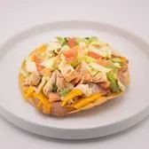 A crispy toasted corn tortilla layered with creamy refried beans, melted cheddar cheese, crisp lettuce, fresh tomato, and tender, juicy chicken breast fajita.