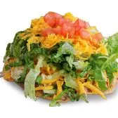 A Crispy Toasted corn tortilla topped with refried beans, melted cheddar cheese, fresh lettuce, and tomato.