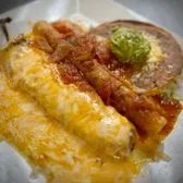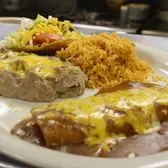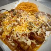 2 beef or cheese chiles rellenos dipped in egg batter and topped with Spanish sauce. Served with rice and beans