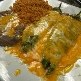 2 beef or cheese chiles rellenos. Served with rice and beans