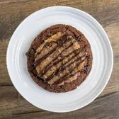 A double chocolate cookie with coconut and pecan German topping and a dark chocolate drizzle.