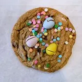 A soft, chewy brown sugar cookie loaded with creamy white chocolate chips and crunchy Cadbury mini eggs, topped with extra candy pieces and finished with a festive dusting of confetti.