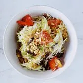 Spicy with green papaya, dried shrimp, peanuts, green beans and fresh tomatoes tossed in lime juice, Thai chilies, and fish sauce. Green papaya, dried shrimp, peanuts, green beans and fresh tomatoes tossed in lime juice, Thai chilies, and fish sauce. The dressing is premade and cannot be made less spicy or modified. We can omit the shrimp and peanuts but we will use the same mortar used with peanuts and shrimp. We cannot make it completely nut or shrimp free (for allergy purpose) Ingredients: Shredded green papaya, dried shrimp (can be omitted), crushed peanuts (can be omitted), tomato, green beans. Dressing: Tamarind water, palm sugar, water, fish sauce, Thai chilies, garlic, lime juice.