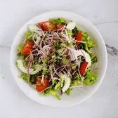 Lemon Thai Basil or Spicy Peanut Dressing. Texas hydroponic lettuce w/ tomatoes, cucumbers, radishes, purple cabbage, carrots and micro greens.. Lemon Thai Basil or Spicy Peanut Dressing Texas hydroponic lettuce w/ tomatoes topped with microgreens . We also add these vegetables depending on season:shredded carrots, and/or radishes, and/or cucumbers. All veggies in the salad is local except for shredded shallots. Ingredients: Hydroponic greens, carrots, cucumbers, tomatoes with two dressing options. Peanut dressing- Chu chee curry base (Garlic, shallots, chilies, lemongrass, galangal, coconut milk, sugar, salt ), peanut butter, tamarind water, coconut milk, salt, sugar, soybean oil. Thai basil dressing- Thai basil, lemon juice, salt, sugar, pepper, garlic, soybean oil
