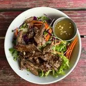 “Yum Nuer” Hydroponic lettuce w/ spicy dressing, sirloin steak, tomatoes, cucumbers, carrots, and shallots. Hydroponic lettuce with spicy dressing, sirloin steak, tomatoes, cucumbers, carrots, cilantro, micro greens,. Depending on season, we sometimes put radishes or beets in the salad too. Ingredients: Hydroponic greens, tomatoes, cucumbers, carrots, grilled beef sirloin, cilantro Dressing: Fish sauce, sugar, water, Thai chilies, garlic, lime juice.