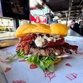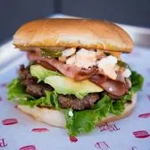 beef patty, bacon, shaved lettuce, red onions, blue cheese crumbles, & garlic aioli on a toasted challah bun.