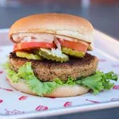 Red bean & mushrooms patty, lettuce, tomato, onions, pickles, mayo