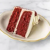 Two layers of a classic red velvet cake with rich, cream cheese buttercream icing