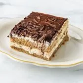 Layers of lady fingers, mousse, and chocolate sandwiched together and topped with a dusting of cocoa powder and dark chocolate flakes.