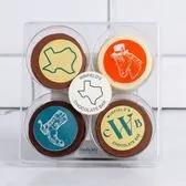 A selection of four double-stuffed Oreos covered with milk chocolate, dark chocolate, and white chocolate and decorated with a Texas theme. (Bulk orders require 24 hour notice)