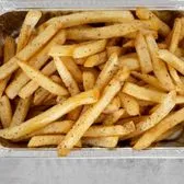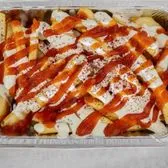Loaded fries with salt, pepper, ketchup, white sauce and hot sauce.