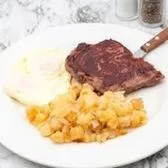8 oz. Breakfast ribeye, 2 basted eggs, and potatoes. Served with your choice of side.