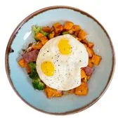 Medley of roasted sweet potatoes, broccoli, mushrooms, and red pimentos tossed with savory turkey bacon, Swiss and cheddar cheese, and topped with 2 eggs.