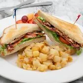 Turkey or ham with bacon, Cheddar, Swiss cheese, fresh lettuce, tomato, and grilled bread. Seved with choice of side.
