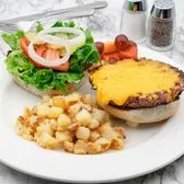 6 oz hamburger patty with cheddar cheese on a Brioche bun with toppings and choice of side.