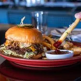 6oz patty, American cheese, miso caramelized onions, and Japanese pickles served on a bed of bibb lettuce and peached social sauce all in a potato bun
