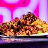 With notes of sour plum our Sweet and Sour Chicken is served with grilled red and green bell peppers, onion and pineapple. It's a classic, our's is delish!** Can also be made in vegetarian format with tofu or cauliflower as your protein base!!**All dishes served with rice, vegetable and eggroll with a fortune cookie! Eggroll comes with chicken and cabbage on the inside, can also be made vegetarian!