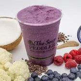 blueberry, raspberry, cauliflower, raw cacao, date, blue spirulina, maca, almond butter, raw coconut oil, coconut water