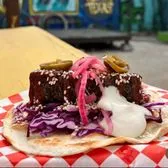 Smoked red pea tempeh, bbq sauce, cabbage, sour cream, pickled jalapenos, pink onions, sesame seed.