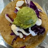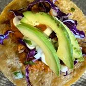 Non-gmo buffalo chicken, vegan cheese, purple cabbage, avocado, vegan sour cream, chipotle sauce.