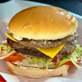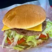 Charcoal grilled hamburger with American cheese, lettuce, tomato, pickles, onions and mayo.
