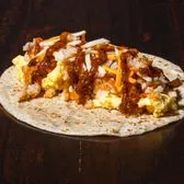 Eggs, refried pinto beans, potatoes, chorizo, green chile queso, mixed cheese, wrapped in a flour tortilla with a side of roja salsa and tomatillo sauce. Contains: eggs, milk, soy, wheat.