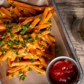 French Fries, with spicy creamy sauce and chives and ketchup on the side