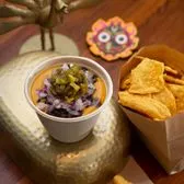 Locally made corn chips with our awesome house-made organic queso dip with black beans, red onion, and diced pickled jalapenos added into the mix! Nut-free, soy free and gluten free! Regular 1-3 ppl Large 3-6 ppl