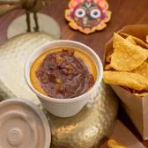 locally made corn chips with our awesome house-made organic queso dip with our famous organic tempeh chili added into the mix!nut-free, soy free and gluten free! regular 1-3 ppl large 3-6 ppl