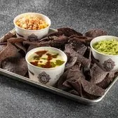 Dip Trio, choose three: queso, guac, or elote, or roasted poblano salsa
