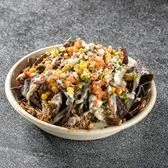 Brisket nachos (GF) † Regular Kick Ass, barbacoa style brisket, queso blanco, corn pico, lime crema, chimichurri, queso fresco | 580 cal.