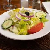 iceberg lettuce, tomatoes, black olive, red onion, cucumber, pepperoncini pepper, croutons