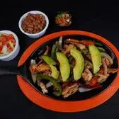 1/2 lb of grilled beef or chicken, sautéed with onions and bell pepper, topped with avocado slices served with pico de gallo and whole beans.