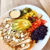 Blackened chicken fish or veggies with Mexican rice, black beans, avocado, tomato, corn, cotija, pickled jalapeno, fajita veggies & chives. Choice of cilantro lime or spicy mango dressing.
