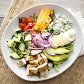 Grilled chicken, hard boiled eggs, avocado, red onion, cherry tomatoes, cucumber, cheddar & bleu cheese crumbles on mixed greens with a side of ranch.