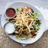 Grilled chicken, jack cheese, avocado, black bean & corn pico, diced tomatoes & sour cream on shredded lettuce and mixed greens. Topped with tortilla strips and chives and served with a side of ranch and salsa.