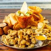 Shrimp campechana, mac & cheese brisket balls, fried pickles, fried jalapeños, onion rings served with BBQ ranch and ranch.