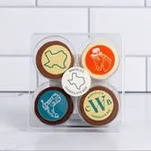 A selection of four double-stuffed Oreos covered with milk chocolate, dark chocolate, and white chocolate and decorated with a Texas theme. (bulk orders require 24 hour notice)