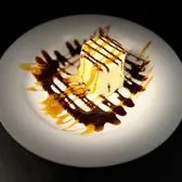 Rich chocolate cake drizzled with caramel and chocolate sauce.