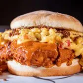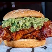 Chipotle tossed crispy chicken sandwich topped with crispy bacon and guacamole.