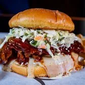 BBQ chicken sandwich with melted cheese, coleslaw.
