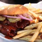 It's not complicated. Tender and juicy beef brisket, bbq sauce over top. Choose any of our three bbq choices, or get crazy and do some honey hot. Served with pickles and onions.
