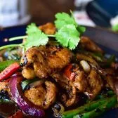 organic chicken breast with local bell peppers and onions, and a fermented black bean sauce