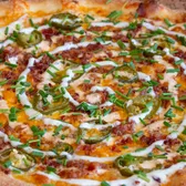 Bacon, cheddar, jalapenos, chives, blue cheese ranch swirl, with a SriRANCHa™ Pizza Base, topped with a SriRANCHa™ swirl.