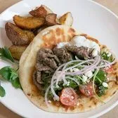 Free-range lamb on pita, feta, arugula, onions, Ziziki's sauce, potatoes