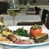 Roasted tomato, spanakopita, veggie skewer, dolmades