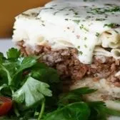 Greek lasagna, layers of lamp, macaroni, tomatoes, bechamel, plum tomato sauce